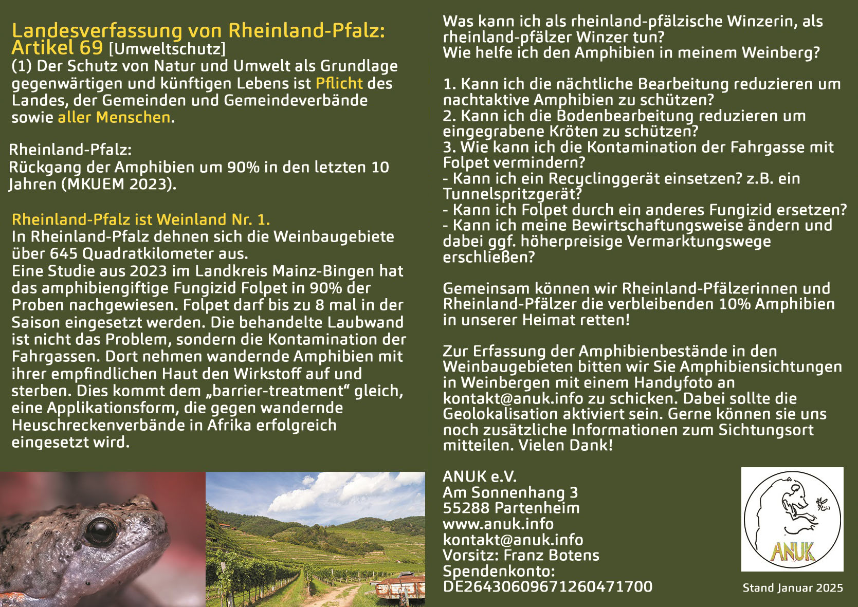 Eine Studie aus 2023 im Landkreis Mainz-Bingen hat das amphibiengiftige Fungizid Folpet in 90% der Proben nachgewiesen. Folpet darf im Weinbau bis zu 8 mal in der Saison eingesetzt werden. Die behandelte Laubwand ist nicht das Problem, sondern die Kontamination der Fahrgassen. Dort nehmen wandernde Amphibien mit ihrer empfindlichen Haut den Wirkstoff auf und sterben. Dies kommt dem „barrier-treatment“ gleich, eine Applikationsform, die gegen wandernde Heuschreckenverbände in Afrika erfolgreich eingesetzt wird.